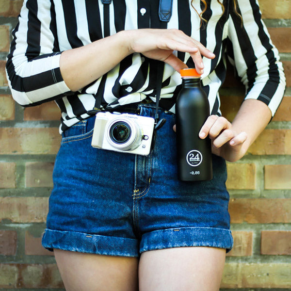 Die Edelstahl Flaschen sind 21 cm hoch, 6,5 cm im Durchmesser und gerade mal 100 Gramm schwer. Das Fassungsvermögen beträgt 500 ml, 0,5 Liter. Mit jedem re-fill der Flasche werden 0,08 Kg Co2 gespart, im Verhältnis zur Herstellung einer weiteren 500 ml Plastikflasche. Die Flaschen eignen sich sowohl für warme wie auch für kalte Getränke und sind geschmacks- bzw. geruchsneutral. Das 18/8 stainless steel ist das beste, was es derzeit auf dem Markt gibt, die Flaschen sind damit nahezu unkapputbar. Egal ob beim Sport, beim Fahrradfahren, beim Yoga, beim Laufen, beim Zelten, im Büro, in der Uni, oder unterwegs, die 24bottle ist das perfekte Stadt-Accessoire gegen den Durst. Die Edelstahl Trinkflaschen kommen übrigens in einem schönen Karton verpackt = wunderbare Geschenkidee!