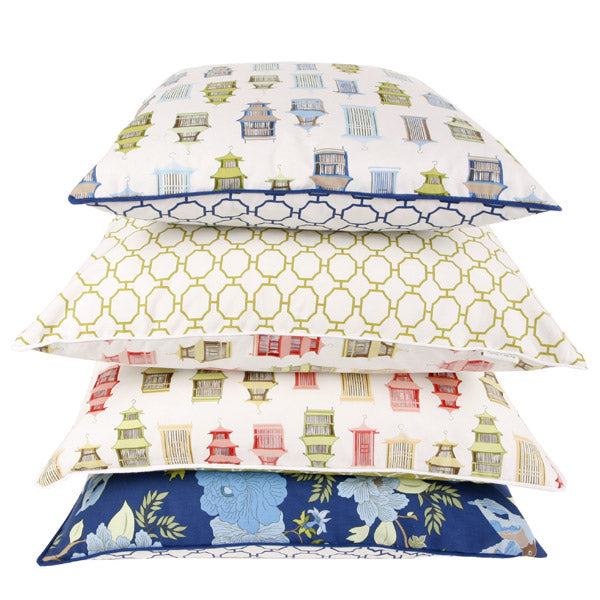 Edles Dekokissen aus feinstem Bio Baumwollstoffen. Cleveres Design: Es handelt sich um ein Wendekissen. Eine Seite ziert ein Muster aus blauen achteckigen Kacheln, die andere Seite ist pastellfarbene Vogelbauer. Der Kissenbezug wurde in Deutschland handgenäht und besteht aus feinsten Materialien. Das beondere Detail: An der Seite wurde ein blaues Schrägband eingearbeitet, so dass der der Kissenrand besonders hübsch abschließt. Dieses Sofakissen passt hervorragend zu den anderen Kissen der ersten Pete & Sally Kissenkollektion, denn hier haben wir die gleichen Bio Baumwollstoffe verwendet. Zusammen wirken die Kissen angenehm hell und frisch. Das 40x40 cm große Dekokissen lässt sich auch als exklusives Stuhlkissen verwenden. Passt in den Wintergarten oder auf die Terrasse genauso wie ins Wohnzimmer oder das hochwertig eingerichtete Kinderzimmer. Einfach schöner wohnen mit den Biobaumwollkissen von Pete & Sally by tujuh! Für alle, die Abwechslung mögen.