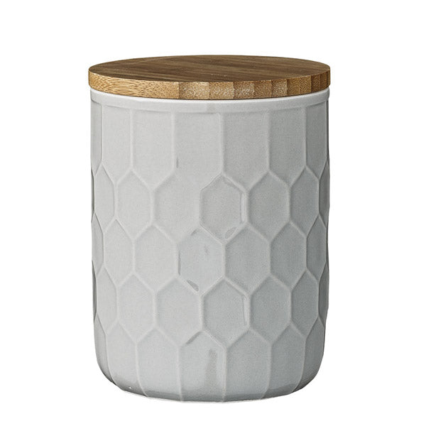 Die Vorratsdose von Bloomingville erinnert uns mit ihrem grafischen Design an eine Bienenwabe aus Wachs. Wir stellen uns dabei vor, wie unzählige, fleißige Bienchen Honig und Pollen hier zusammentragen. Was werden wohl Sie in dieser Vorratsdose mit Bambusdeckel aufbewahren? Süßes, z.B. Bonbons oder Gummibärchen? Oder doch eher Salziges, wie Chips, Nüsschen & Co? Oder wird Ihnen die Aufbewahrungsdose in der Küche zur Hand gehen? Z.B. zum Aufbewahren von Nudeln oder Reis? Oder aber auch für Müsli und Haferflocken? Ganz egal wofür Sie diese Designer-Aufbewahrungsdose aus grauem Steingut verwenden, sie wird nicht nur praktischer Helfer sein, sondern auch schönes Wohnaccessoire. Übrigens, wenn Sie den Deckel weglassen, können Sie in der Steingutdose auch Kochutensilien platzieren, Kochlöffel, Schneebesen... oder Sie stellen die Dose direkt auf dem Tisch und servieren so Ihre Servietten.