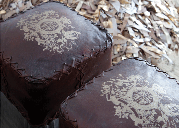 Hocker aus recycelter Wasserbox mit Leder bezogen - drum stool golden crest