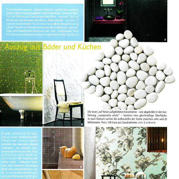 Mit diesem edlen Kieselsteinboden von stein & ambiente wird Ihr Wohnzimmer, Badezimmer oder ihr Saunabereich zum Wohlfühltempel. Die auf Netze aufgeklebten schwarzen Kieselsteine haben eine gleichmäßige Oberfläche. Die Netze des Kieselsteinbodens sind im Format 30x30 cm wie Puzzleteile gefertigt. Durch dieses sogenannten "Interlocking System" verschwinden die einzelnen Netzübergänge und eine einheitliche Kieselstein-Steinstruktur entsteht. Die Oberflächenstruktur des Natursteinbodens ist angenehm für die Füße - Fußmassage inklusive. Die Kieselsteinfliesen von stein & ambiente können auch an der Wand verlegt werden. Holen Sie sich mit diesem individuellem Natursteinfliesen den Kieselsteinstrand ins Haus! Der natürliche Baustoff Kieselstein ist langlebig und zeitlos, sowie frei von Schadstoffen. Die Kieselsteinfliesen von stein & ambiente sind bekannt aus der Presse, unter anderem aus "Schöner Wohnen", "Häuser" und "Country".